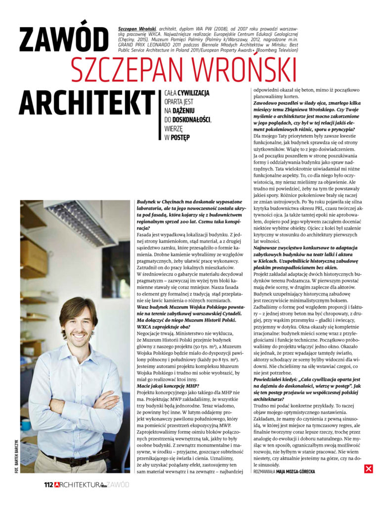 Zapraszamy do lektury najnowszego wydania czadopisma „Architektura Murator”. W dziale „Zawód Architekt” rozmowa ze Szczepanem Wrońskim, właścicielem pracowni WXCA.