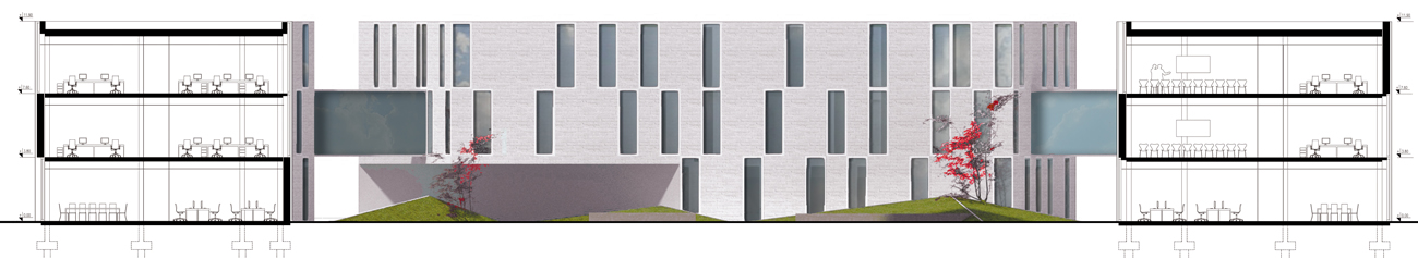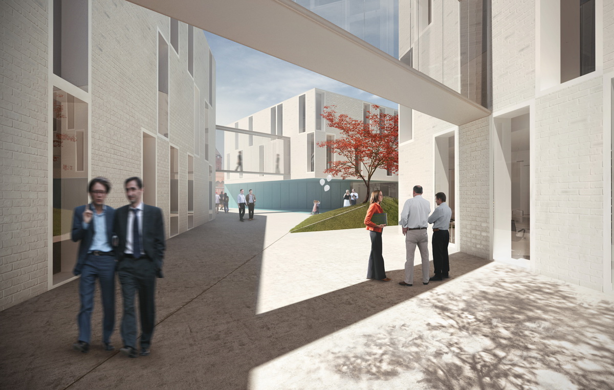 Skrzywienie kierunków ścian dziedzińca umożliwiło odcięcie widoku na przestrzał poprzez budynek na znajdujący się za nim parking. Podziały posadzki romboidalnego dziedzińca na trójkątną siatkę stały się osnową dla koncepcji wewnętrznego ogrodu.