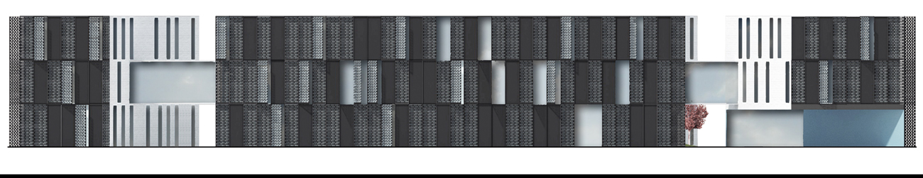 W celu zróżnicowania charakteru wnętrza dziedzińca od zewnętrznej powłoki budynku zakładamy użycie dwóch skrajnie różnych materiałów. Zewnętrze poszycie budynku stanowić będą panele z perforowanej stalowej blachy w kolorze grafitu, inspirowane przemysłowo industrialnym chrakterem. Panele zamocowane są w frmie ruchomych okennic zmieniają odbiór budynku w ciągu dnia, sprawiają wrażenie ciągłego ruchu, pozwalając jednocześnie kontrolować dopływ światła do pomieszczeń. Ściany patio zostały wykończone klinkierową glazurowaną cegłą.