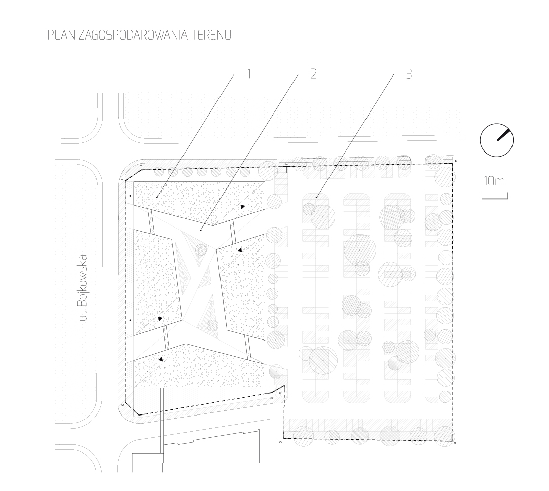Koncepcja układu urbanistycznego powstała w wyniku rozsunięcia brył wspólnie tworzących zamknięty kwartał. Wewnątrz kwartału ukształtowano dziedziniec – ogród. Umożliwia on odpowiednie doświetlenie pomieszczeń biurowych i tworzy przyjazną kameralną przestrzeń dla pracowników. Bryła została przecięta w 4 miejscach, symetrycznie względem swej pionowej osi tak by umożliwić swobodne przemieszczanie się z parkingu na teren dziedzińca i dalej w kierunku pozostałych budynków kompleksu.