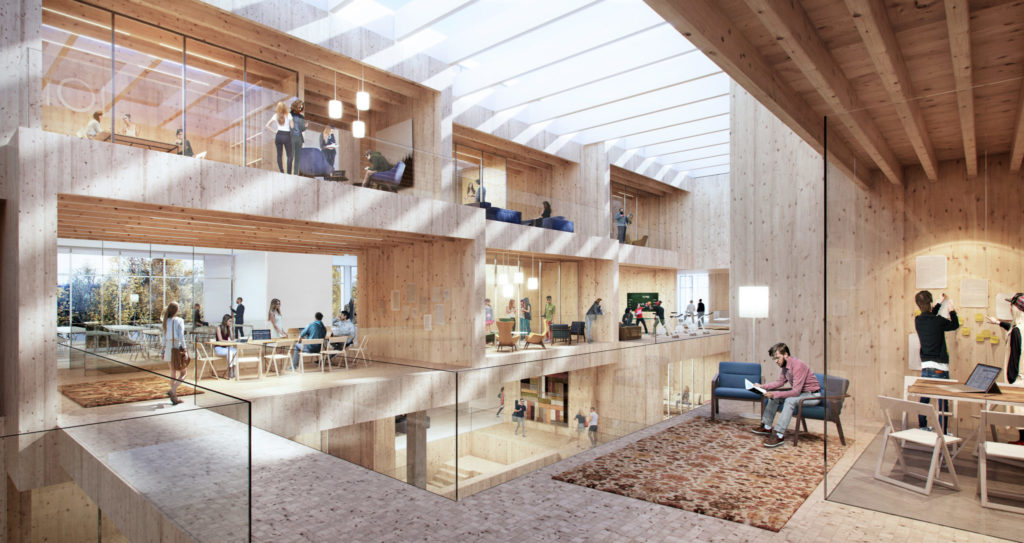 Warstwę zewnętrzną tworzy pas pomieszczeń „technologii” edukacji – o modularnym, racjonalnym rozplanowaniu oraz oszczędnym, utylitarnym wystroju i wyposażeniu. Warstwa wewnętrzna, to wieniec pomieszczeń o rozluźnionym układzie przestrzennym tworzących bardziej nieformalne środowisko interakcji społecznych i aktywności. Ich wystrój i wyposażenie mają kontrastujący, domowy charakter. Intermedium pomiędzy warstwą zewnętrzną i wewnętrzną wypełnia wewnętrzna ulica komunikacyjna, która rozgałęzia się na zewnątrz w stronę fasady oraz do środka w kierunku atrium, stanowiąc uniwersalne spoiwo pozwalające konfigurować różne kombinacje typów pomieszczeń studenckich i pracowniczych. W centrum budynku znajduje się czterokondygnacyjne atrium, a na dachu – otwarte patio z wewnętrznym ogrodem.