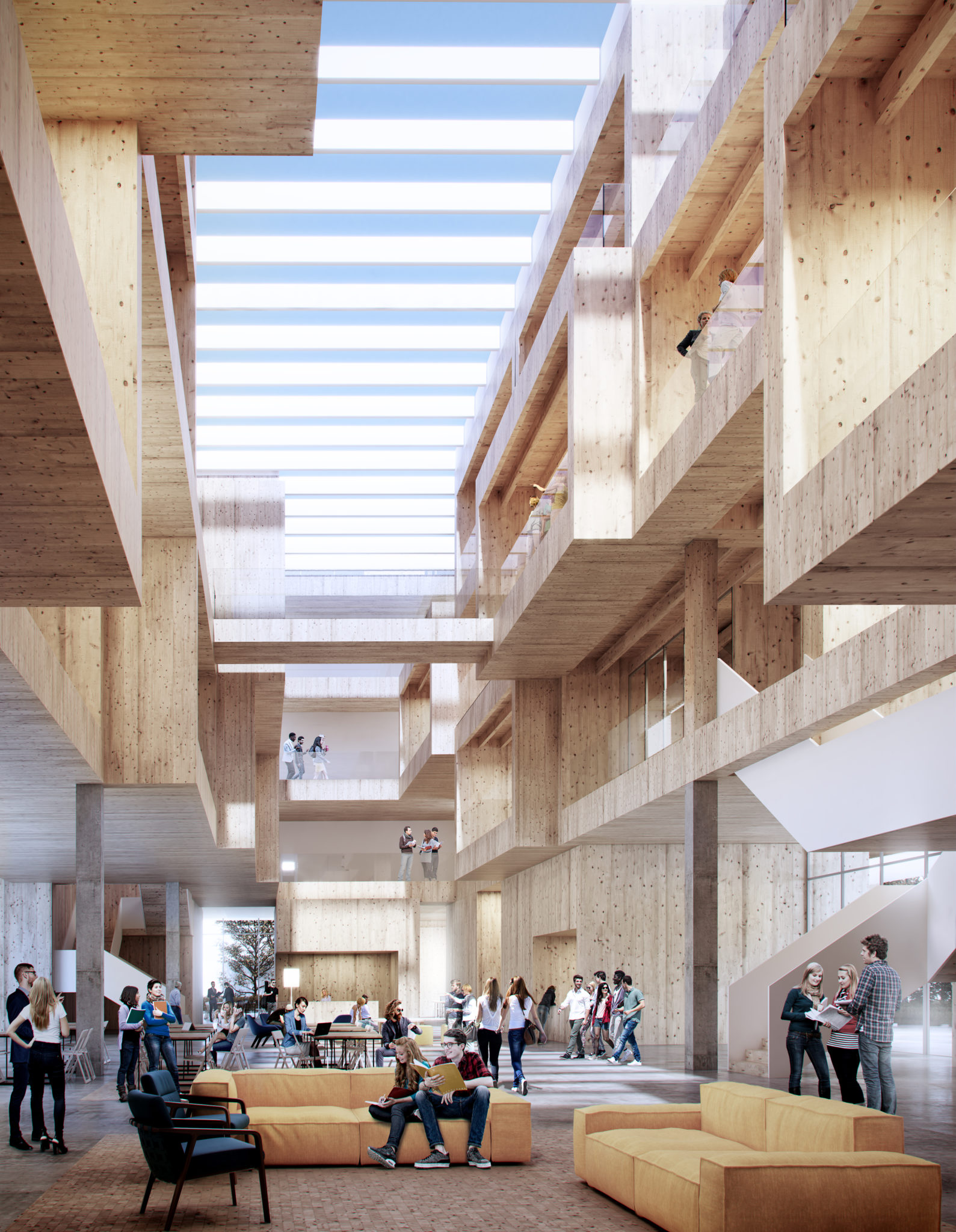 Przestrzeń Centralna – Budynek i Forum. W strefie centralnej kampusu dychotomia budynek vs. kontekst została zastąpiona przez perspektywę integrującą, w której budynek i jego kontekst stanowią jedność. W strefie parteru, struktura przestrzenna parteru Budynku i przyległego Forum Studenckiego są oparte na tej samej wspólnej kanwie kompozycyjnej, która jest interpretowana w sposób architektoniczny (w strefie budynku) lub krajobrazowy (w strefie Forum).