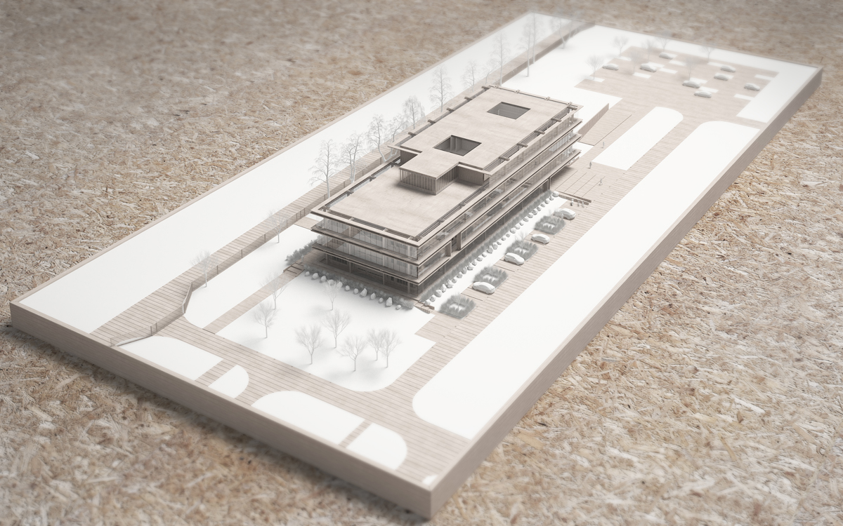 Forma budynku ukształtowana została w sposób podporządkowany funkcji przy możliwe oszczędnych środkach wyrazu. Z zwartej wydłużonej prostopadłościennej bryły wycięte zostały trzy przestrzenie doświetlające komunikację i pomieszczenia wewnętrznej części budynku, tworząc: centralne patio, doświetlenie holu głównego oraz doświetlenie foyer. W płaszczyźnie elewacji podkreślono strefy wejściowe przez wycofanie fasady zapewniając „półotwartą” zadaszoną przestrzeń / plac . Ostateczny zewnętrzy charakter uzyskany został dzięki dwupowłokowej elewacji zastosowanej w celu zapewnienia odpowiedniej przepuszczalności światła dziennego przez fasadę przy jednoczesnej minimalizacji nakładów energetycznych na ogrzewanie i chłodzenie. Na płaszczyźnie ideowej natomiast, zabieg ten skutkuje wtopieniem się budynku w otaczający krajobraz poprzez stworzenie „kalki” otoczenia subtelnie odbijającego się w zewnętrznej fasadzie.