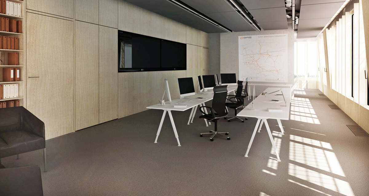 Układ funkcjonalny budynku oparto na symetrycznie rozmieszczonych dwóch węzłach komunikacji pionowej, znajdujących się przy dwóch wejściach do budynku, spiętych cyrkulacyjnym układem komunikacji poziomej. Wydzielono w ten sposób dwie podstawowe strefy funkcjonalne: zewnętrzną biurową o szerokości traktu 4,6m oraz wewnętrzny „trzon” mieszczący powtarzalne dla każdej kondygnacji funkcje dodatkowe takie jak: zaplecze socjalne , sanitarne, sale konferencyjne, piony techniczne etc. Podstawą takiego założenia było stworzenie możliwe prostego i intuicyjnego dla użytkowników budynku. Podział ten ma również swoje odzwierciedlenie w energetycznym koncepcie budynku w którym przestrzenie biurowe skryte za podwójną fasadą mogą optymalnie wykorzystywać oświetlenie i energie słoneczną, zaś monolityczny „trzon” dzięki dużej pojemności cieplnej akumuluje energie cieplną. Poszczególne działy rozmieszczono po obwodzie budynku, sytuując pomieszczenia związane z obsługą klienta w pobliżu węzła przy głównym wejściu, natomiast pomieszczenia nastawione na wewnętrzną prace w tym gabinety dyrektorskie przy węźle związanym z wejściem od ul. Aleja. Na najwyższej kondygnacji biurowca umieszczono dział administracji aplikacjami oraz oddziałową dyspozytornię gazu wraz ze strefą zamkniętą. Oba węzły komunikacyjne powiązane są z podziemną kondygnacją na której prócz garażu pod „trzonem” biurowca zlokalizowano ciąg pomieszczeń technicznych.