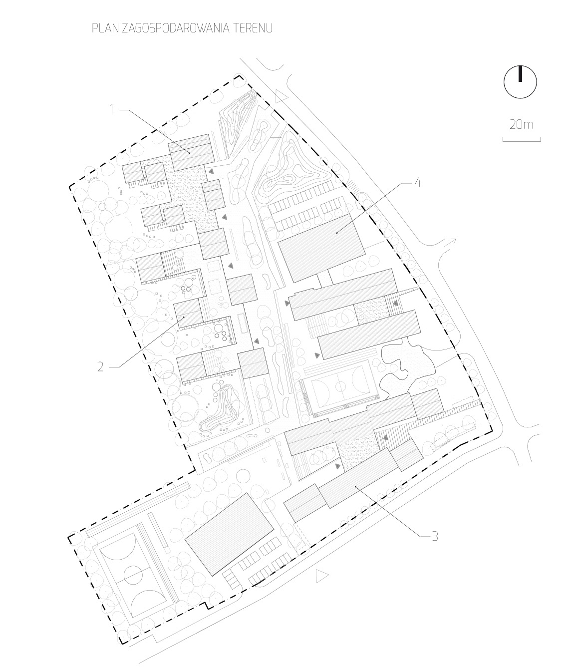 Dzisiejsza szkoła nie tylko przekazuje wiedzę, ale również inspiruje, aktywizuje, wychowuje, integruje swoich uczniów, pozwala na ich wielopłaszczyznowy rozwój również poza godzinami lekcyjnymi. Taką właśnie przestrzeń – otwartą, integrującą i inspirującą chcieliśmy stworzyć projektując zespół budynków przedszkolno – szkolnych w Wilanowie. Proponowana przez nas zabudowa jest wtopiona w zieleń, która przenika budynki i okala je niemal z każdej strony. Całość założenia podzielona jest wewnętrznym zielonym pasażem, stanowiącym wymagane zapisem Miejscowego Planu Zagospodarowania Terenu powiązanie zieleni. Pasaż jest jednocześnie atrakcyjną przestrzenią publiczną, a także umowną granicą pomiędzy strefą dzieci młodszych i starszych.