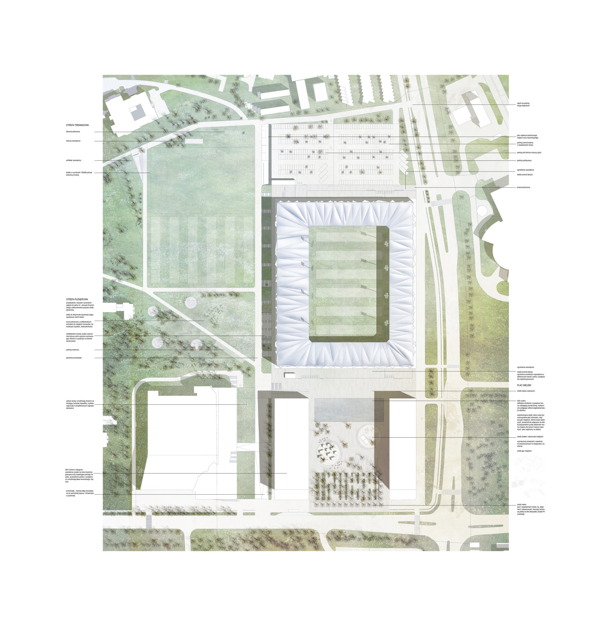 Od południowej strony zaproponowano plac miejski o utylitarnym charakterze. Bryły centrum usługowego i hotelu domykają boczne ściany placu. Wprowadzono usługi i powierzchnie komercyjne w parterach budynków, co pozwala na wykreowanie placu miejskiego, funkcjonującego niezależnie od wydarzeń sportowych. Od strony Alei Marszałka Józefa Piłsudskiego plac rozpoczyna się rytmiczną sekwencją drzew. Centralną część placu zajmuje strefa działań i aktywności miejskich. W dalszej części placu zaprojektowano delikatne i płynne obniżenie w posadzce, tworzące taflę wodną. W zależności od potrzeb, nieckę wodną można przekształcić w przestrzeń wydarzeń masowych, koncertów czy sezonowych aktywności takich jak lodowisko, boiska siatkowe.