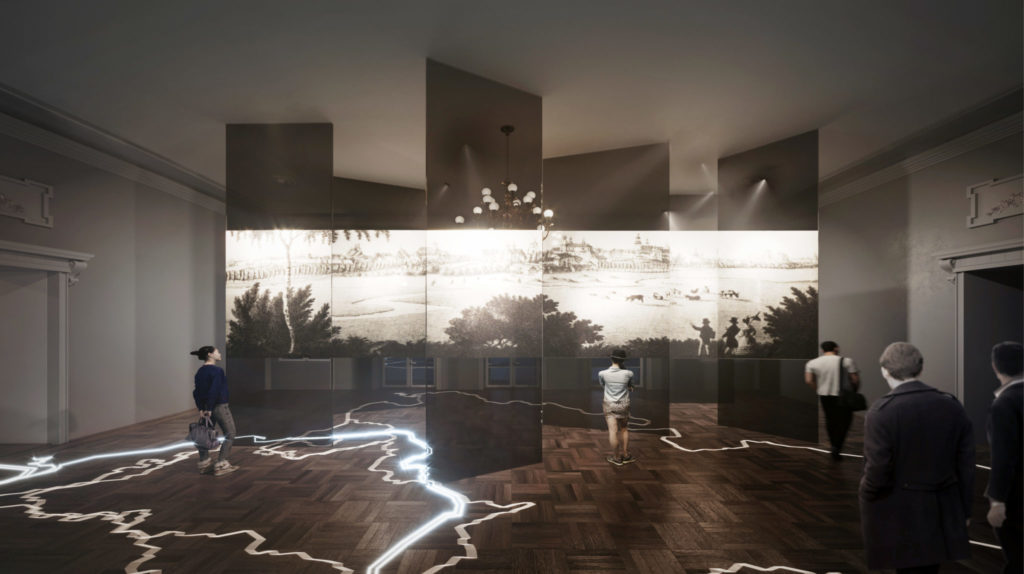 Ciekawym rozwiązaniem jest potraktowanie samej architektury i historii budynku jako elementu wystawy. Ten wątek będzie stanowił uzupełnienie ekspozycji i będzie przedstawiony zarówno w formie odpowiednio zakomponowanych odkrywek ukazujących wybrane warstwy oryginalnych farb, tynków, struktury ceglanej, jak i multimedialnie – za pomocą rozszerzonej rzeczywistości. Zwiedzający poprzez okulary VR będą mogli przenieść się w wybrany okres życia budynku i miasta, odkrywając architekturę, stroje, dekoracje i wydarzenia z minionych czasów.