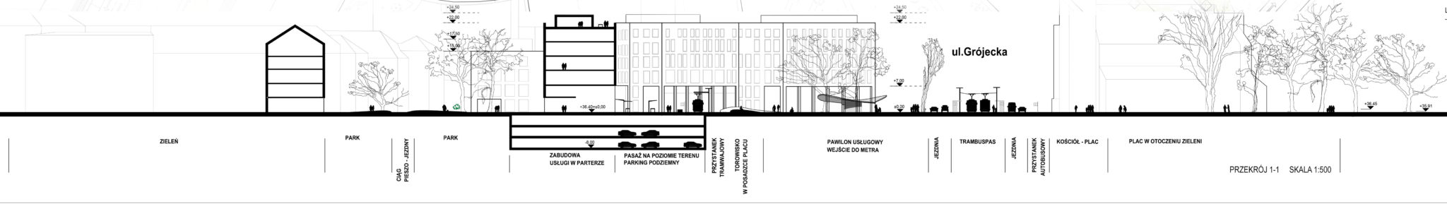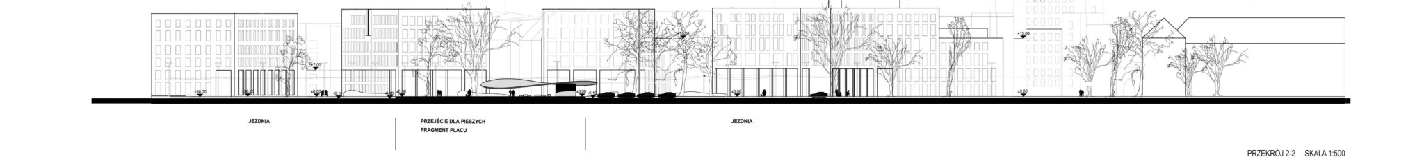 Zgodnie z tendencją do ograniczania ruchu tranzytowego przez miasto, a także dążenia do ograniczania ruchu samochodowego w obrębie Centrum i Śródmieścia, zaproponowaliśmy obniżenie klasy ulicy, zawężenie pasów ruchu, wprowadzenie parkowania równoległego oraz nowo projektowanych ścieżek rowerowych, a także pasów zieleni. Uzyskaliśmy odpowiedni przekrój ulicy, który nie stanowi bariery i zagrożenia dla użytkowników przestrzeni publicznej. Ponadto zaprojektowane zostało szerokie przejście dla pieszych na wysokości posadzki placu, która wzmacnia powiązanie kościoła z placem i jednocześnie stanowi próg zwalniający dla samochodów.