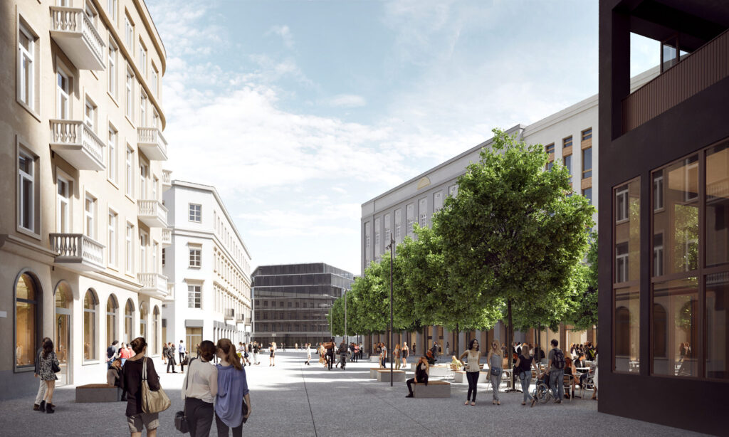 Nowo nasadzone, dające cień drzewa, fontanna, nowoczesna mała architektura, iluminacja – to wszystko stworzy prestiżową przestrzeń publiczną. Wprowadzenie pomiędzy zwarte kwartały zabudowy drzew liściastych zamieni ten plac w spokojną enklawę w zurbanizowanej tkance miasta. Obecność drzew oswoi otwartą przestrzeń placu.