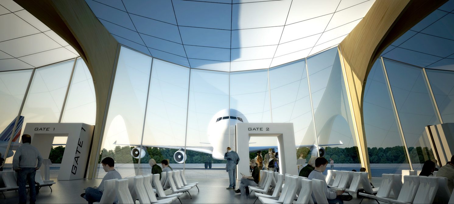 Kształt lotniska staje się strefą buforową miedzy lasem, z którego wyrasta a powietrzem, w którym się unosi. Drewniane dźwigary podkreślają naturalny charakter założenia, a dach wpuszczający promienie słoneczne uwidacznia lekkość konstrukcji. Dach podzielony został modułowo na 17 sekcji o trójkątnym rzucie. Zastosowane górne doświetlenie hali głównej, zapewnia doprowadzenie do wnętrza terminala dużej ilości naturalnego światła, co w sposób istotny podnosi jakość jego przestrzeni. Fasadę budynku zaprojektowano jako przeszkloną w całości szkłem o odpowiednich parametrach. Przejrzystość funkcji pozwala użytkownikom portu lotniczego na łatwiejszą orientację, a co za tym idzie poprawia komfort pracy służbom operacyjnym jak i sprawia, że przepływ pasażerów odbywa się płynnie. Odpowiednia lokalizacja funkcji lotniskowych skraca do minimum czas, który pasażer potrzebuje do przejścia ze strefy „landside” do strefy „airside”. Eliminuje to powstawanie dużych skupisk ludzi i zapewnia większe bezpieczeństwo portu lotniczego.