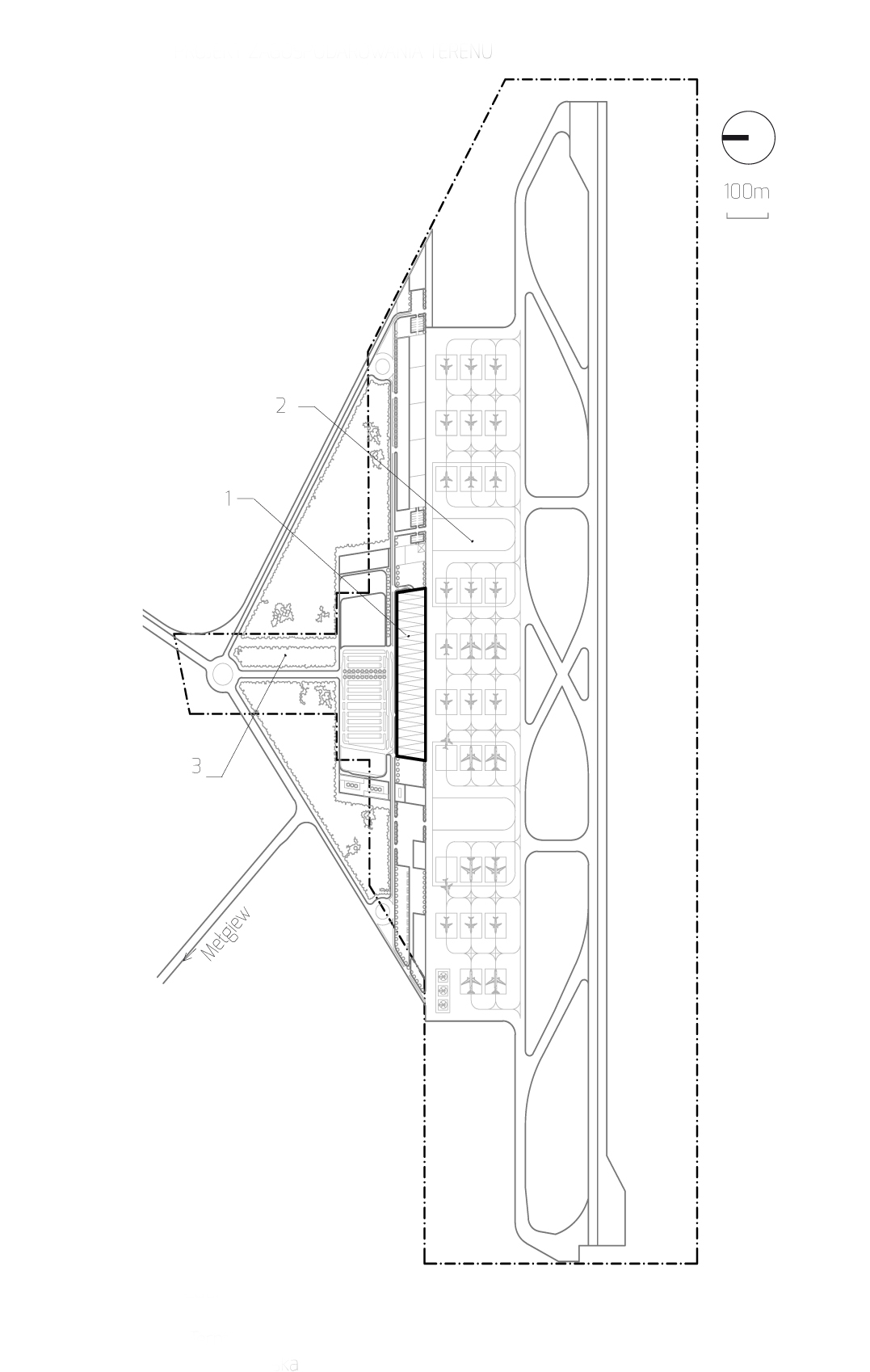 Cały teren mieści się na planie trójkąta, po którego obwodzie zaprojektowana została droga technologiczna. Od strony południowej zaprojektowano węzeł komunikacyjny w postaci ronda, gdzie przecinają się drogi pieszo jezdne oraz drogi kolejki osobowej. Głównym obiektem kubaturowym jest budynek terminala. Jest to hala mieszcząca obie strefy funkcjonalne, tzn. związane z płytą lotniska (airside) – sortownię bagażu, poczekalnie, hale odbioru bagażu przylatującego jak również strefy związane ze stroną miejską (landside) – hale odpraw biletowo-bagażowych (odlotów i przylotów), biura linii lotniczych, oraz gastronomię.