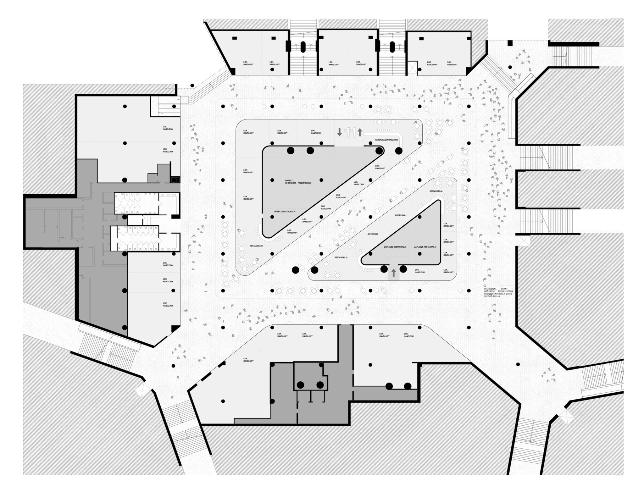 Istniejąca struktura konstrukcyjna hali pozwala wykorzystać siatkę słupów do wytyczenia dwóch stref – strefy szybkiej komunikacji (zewnętrznej) oraz wewnętrznej strefy handlowo – sługowej, uspokojonej. W tym celu linia witryn wewnątrz hali została wycofana w stosunku do linii słupów, ograniczając w ten sposób kolizję pomiędzy użytkownikami poszczególnych stref.