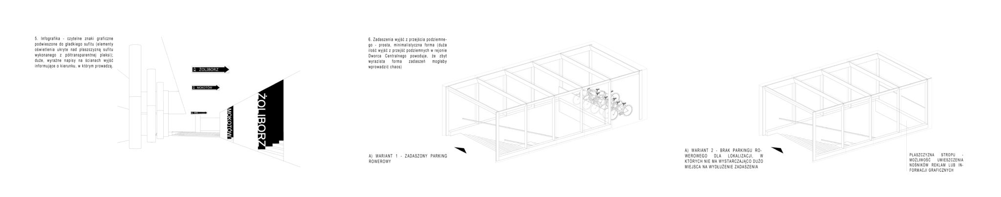 Przewiduje się uporządkowanie i uczytelnienie znaków graficznych z informacją o kierunkach wyjść z przejść podziemnych. W tym celu proponuje się zastosowanie sufitu podwieszonego wykonanego z półtransparentnej pleksi, z oświetleniem ukrytym pod stropem. Gładka płaszczyzna sufitu pozwala lepiej wyeksponować wszystkie znaki informacyjne podwieszone do sufitu. Ponadto zakłada się umieszczenie dużych, czytelnych napisów na ścianach wyjść na poziom terenu z informacją o dzielnicy, w kierunku której prowadzą.