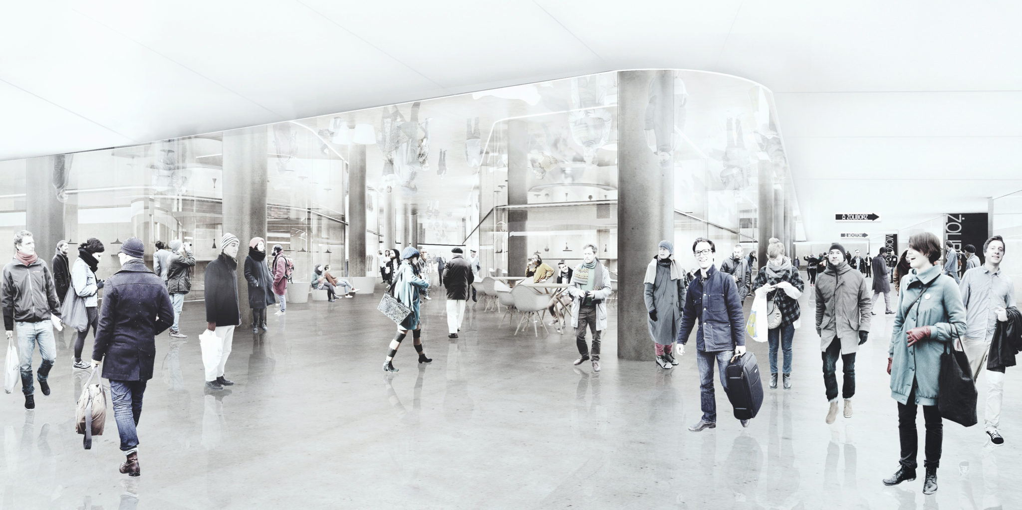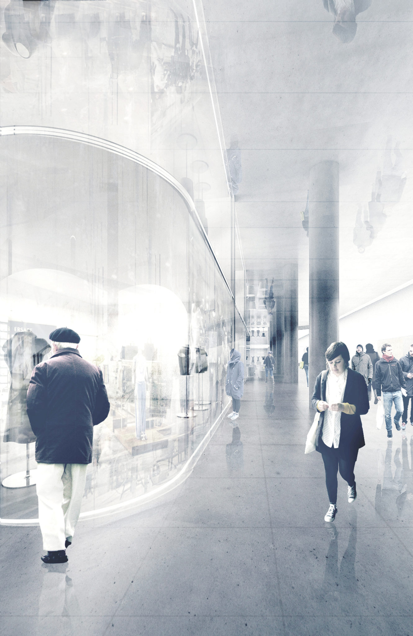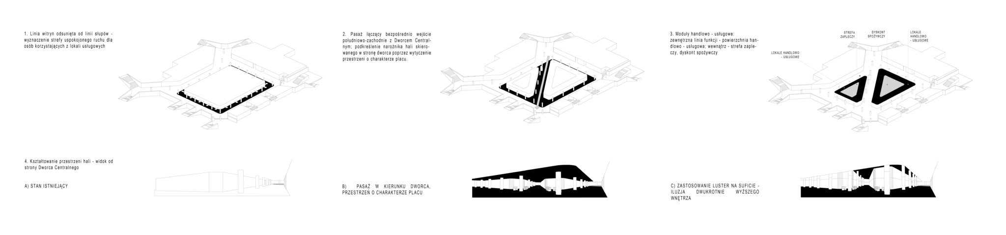 Niniejsza koncepcja modernizacji przejść podziemnych zakłada stworzenie przestronnego wnętrza hali przy zachowaniu możliwie dużej ilości lokali usługowych. Dlatego też sufit w centralnym fragmencie hali został wykonany ze stali o właściwościach lustra, co pozwala stworzyć iluzję dwukrotnie wyższej przestrzeni i ograniczyć poczucie przebywania w ciasnym i niskim przejściu podziemnym. Lustrzany strop został zastosowany w centralnej części hali, podkreślający wewnętrzną przestrzeń handlowo- usługową.