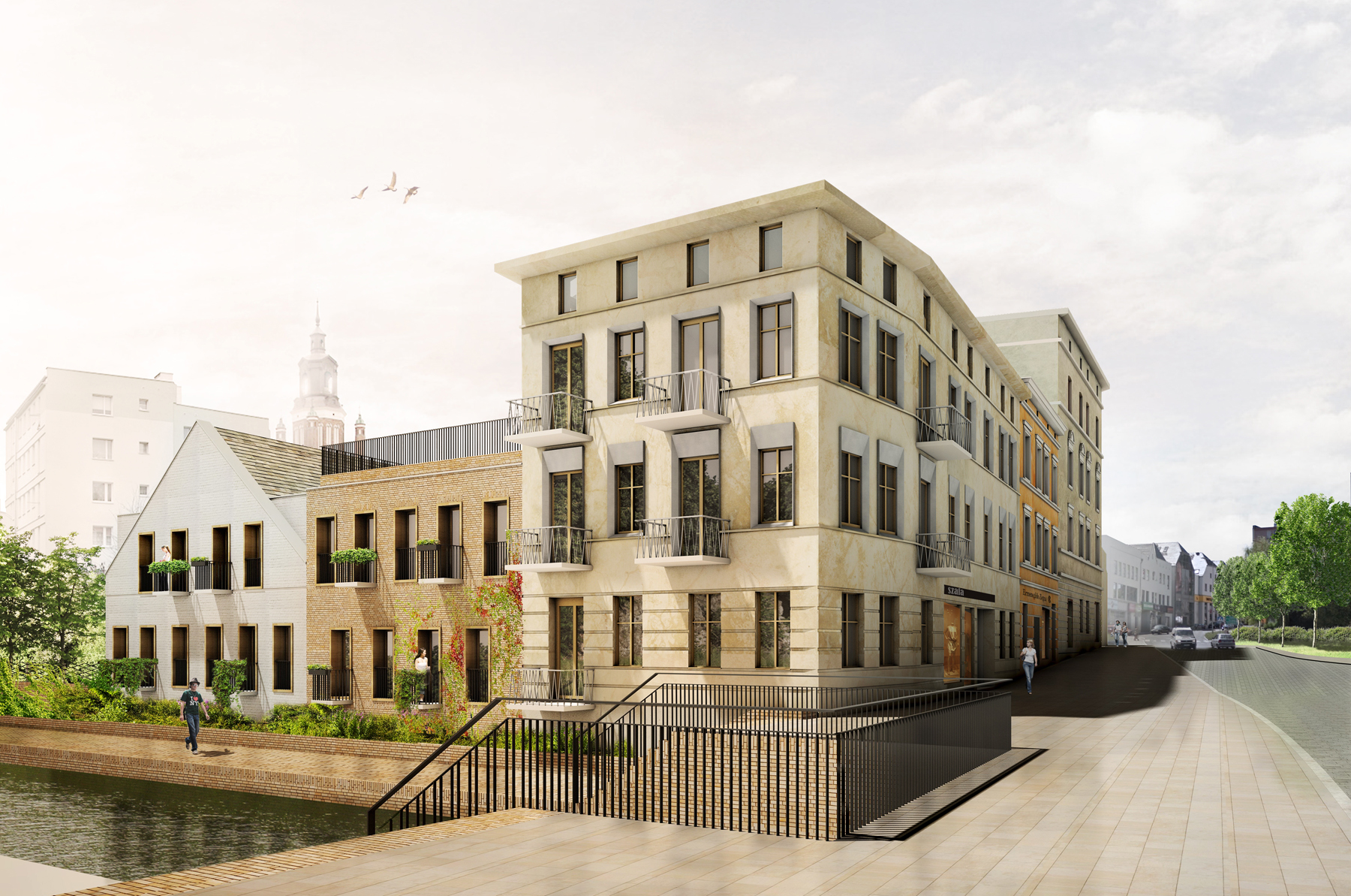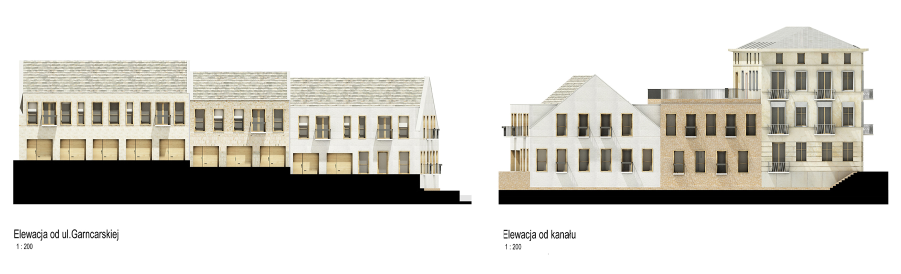 W miejsce wyburzanych garaży planujemy, wzniesienie zabudowy oficynowej, w postaci 3 nowych budynków 2-kondygnacyjncyh od ul. Garncarskiej, które łączą się z ciągiem kamienic oficyną o prostej bryle zwróconej frontem do kanału. Podziały budynków poprowadziliśmy zgodnie z podziałami geodezyjnymi, w nawiązaniu do kamienic istniejących. Dzięki różnicy terenu projektowany zespół oficyn został rozrzeźbiony, kaskadowo schodząc w kierunku rzeki.