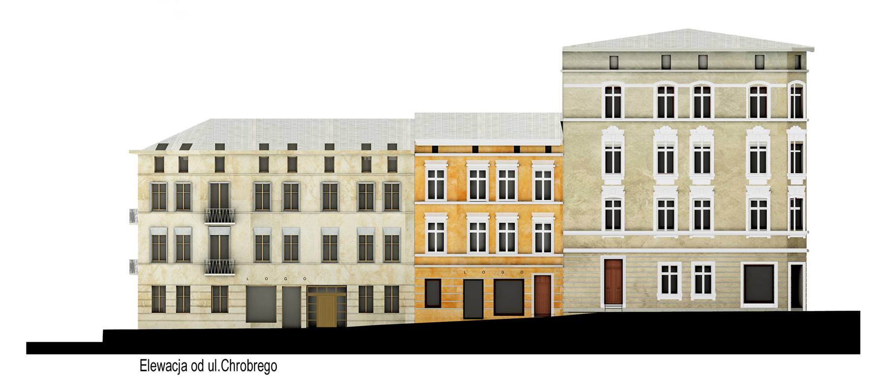 Kamienica 16 poddana zostanie rozbiórce. W jej miejsce proponujemy bryłę, która zachowuje kubaturę istniejącej kamienicy, jej główne podziały, rytm otworów okiennych oraz drzwiowych z uzupełnieniem o nowe na elewacji ślepej ściany szczytowej. Utrzymujemy zasadę gradacji typową dla kamienic czynszowych ? okna na poddaszu użytkowym pozostają mniejsze, smuklejsze. Zastosowaliśmy detale okien nawiązujące do historycznej elewacji, bogatej w gzymsy, opaski okienne i tympanony na poziomie 1.piętra, będące współczesną interpretacją tych historycznych detali, w postaci opasek okiennych wykonanych z blachy stalowej. Proponujemy również odtworzenie boniowania na poziomie parteru, wprowadzenie drobnych gzymsów podokiennych oraz masywnego gzymsu zwieńczającego kamienicę ? nawiązując do kamienicy 12. Dzięki tym zabiegom kamienica nabiera miejskości i dostojnego wyrazu. Elewacja wzbogacona została o balkony z balustradą ażurową z detalem v, zarówno w miejscach pierwotnej lokalizacji od ul. Bolesława Chrobrego, jak również nowe od strony kanału i wnętrza kwartału.