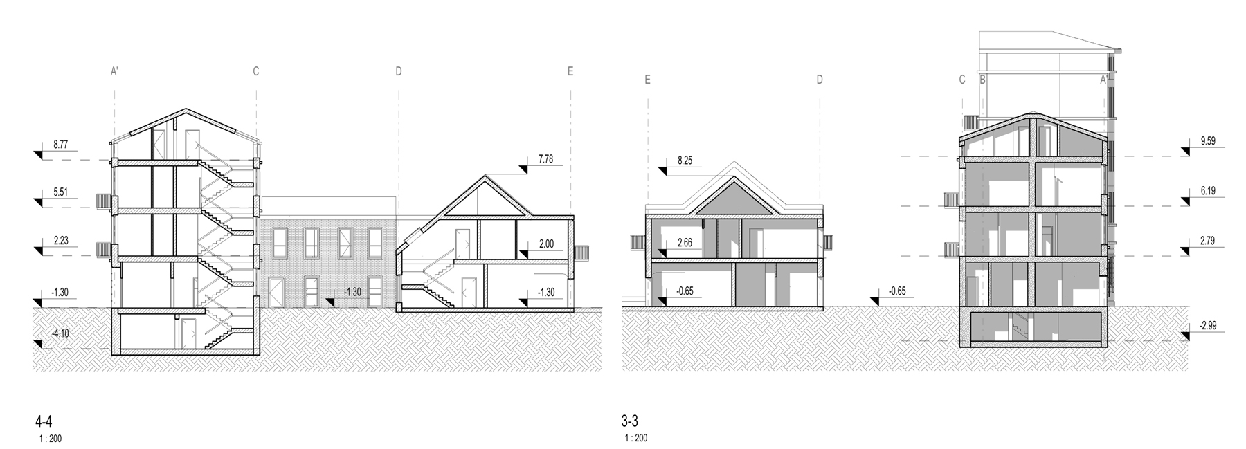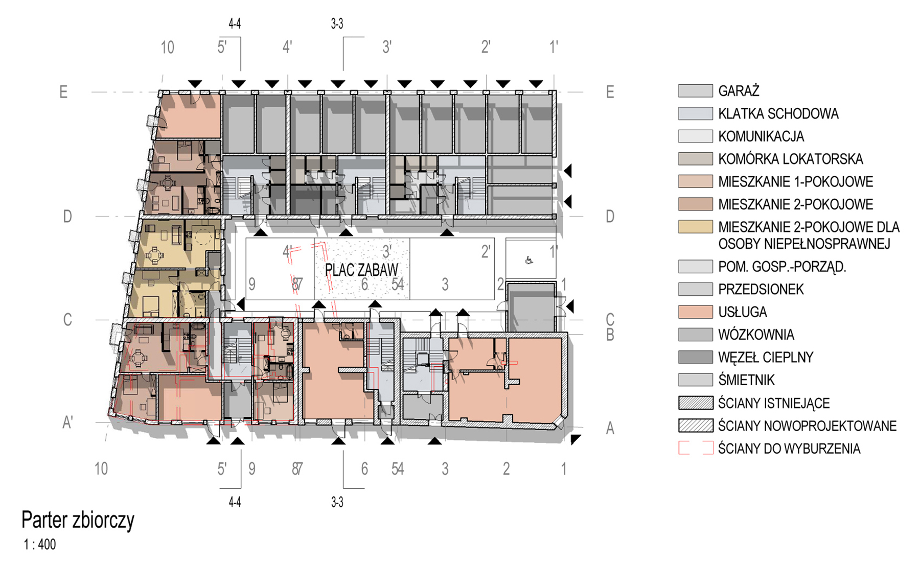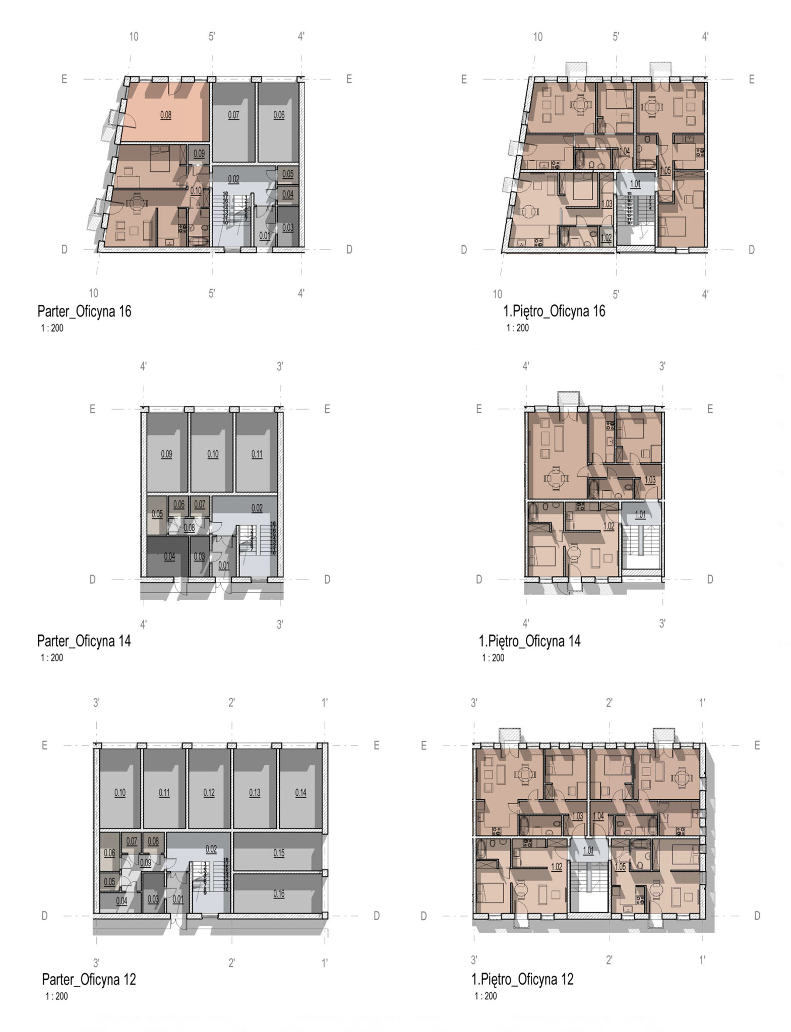 Biorąc pod uwagę charakter istniejących budynków oraz ich wartość historyczną zdecydowaliśmy się na zabiegi w niewielkim stopniu ingerujące w ich strukturę.