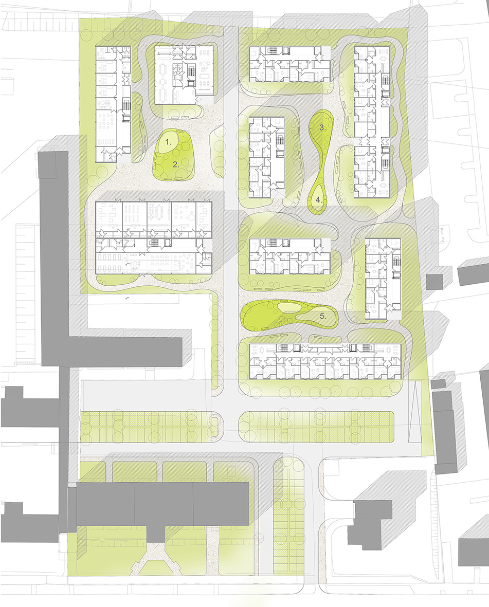 W projekcie pojawia się kilka charakterystycznych stref. Dziewięć projektowanych budynków tworzy 3 place / podwórka , przez które przelewają się ciągi piesze oraz zieleń parkowa. Dwa z nich to przestrzenie bardziej kameralne w strefie tylko mieszkalnej. Trzeci plac zlokalizowany jest wokół budynków usługowo-mieszkalnych. Ma to być miejsce spotkań, organizacji niewielkich eventów czy zajęć sportowych. Usługi wokół tego placu mają dodatkowo pobudzić miejsce do życia. Kolejnym ważnym elementem zagospodarowania jest „zielona” główna aleja łącząca część mieszkalną z częścią usługową. Wspomniana aleja kończy się w okolicy istniejących ogródków działkowych. W przyszłości, w przypadku rozbudowy okolicy może być kontynuowana. Mieszkańcom czas umilać będą małe formy architektoniczne oraz elementy sportowo-wypoczynkowe zlokalizowane w przestrzeniach wspólnych. Są to m.in. altana parkowa, plenerowa siłownia, ogród kwiatowy etc.